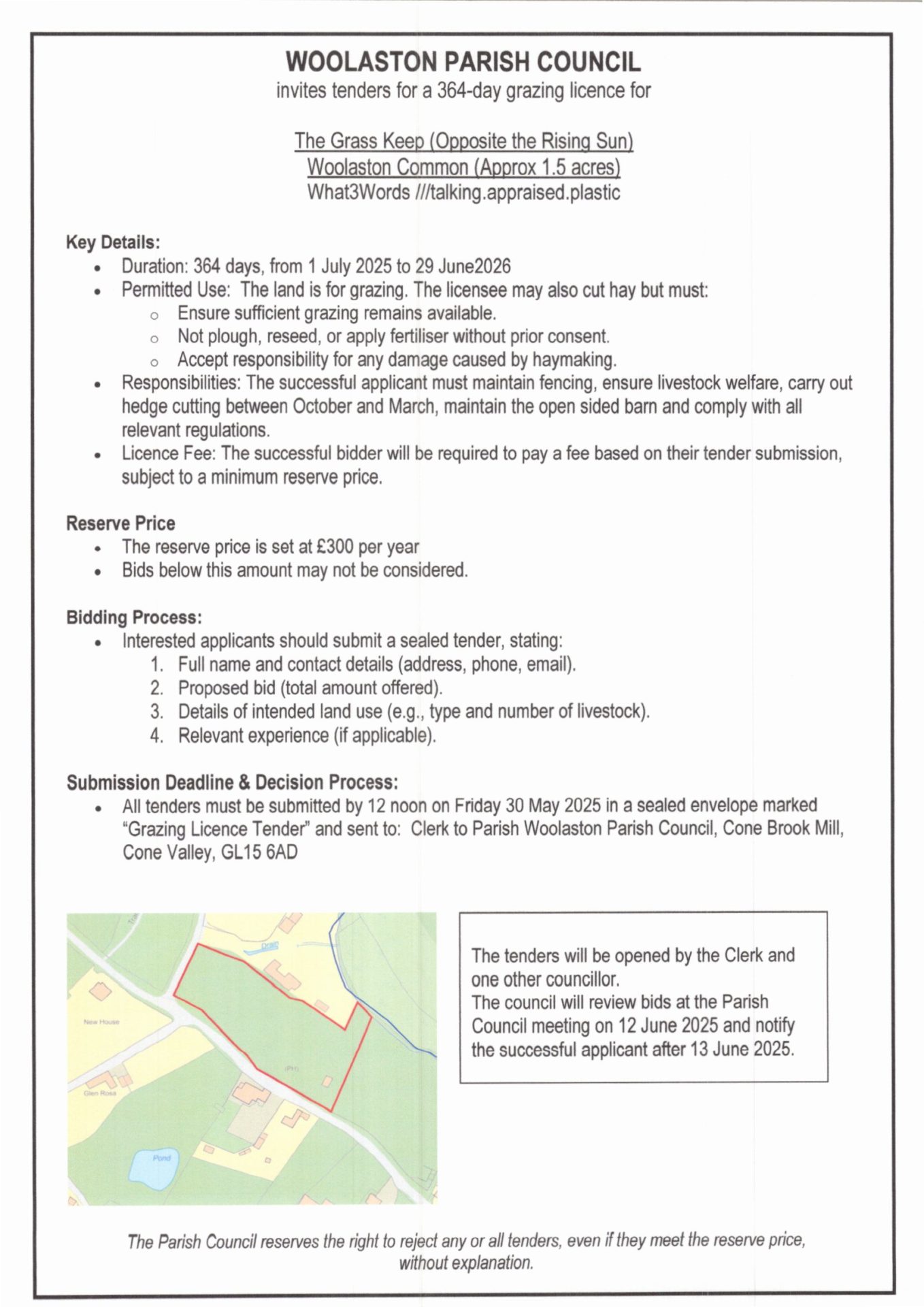 Woolaston Parish Council invites tenders for a 364 day Grazing Licence for land at Woolaston Common (opposite the Rising Sun) from 1 July 2025 to 29 June 2026.